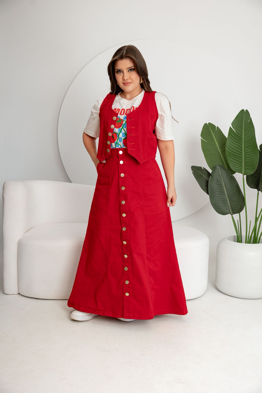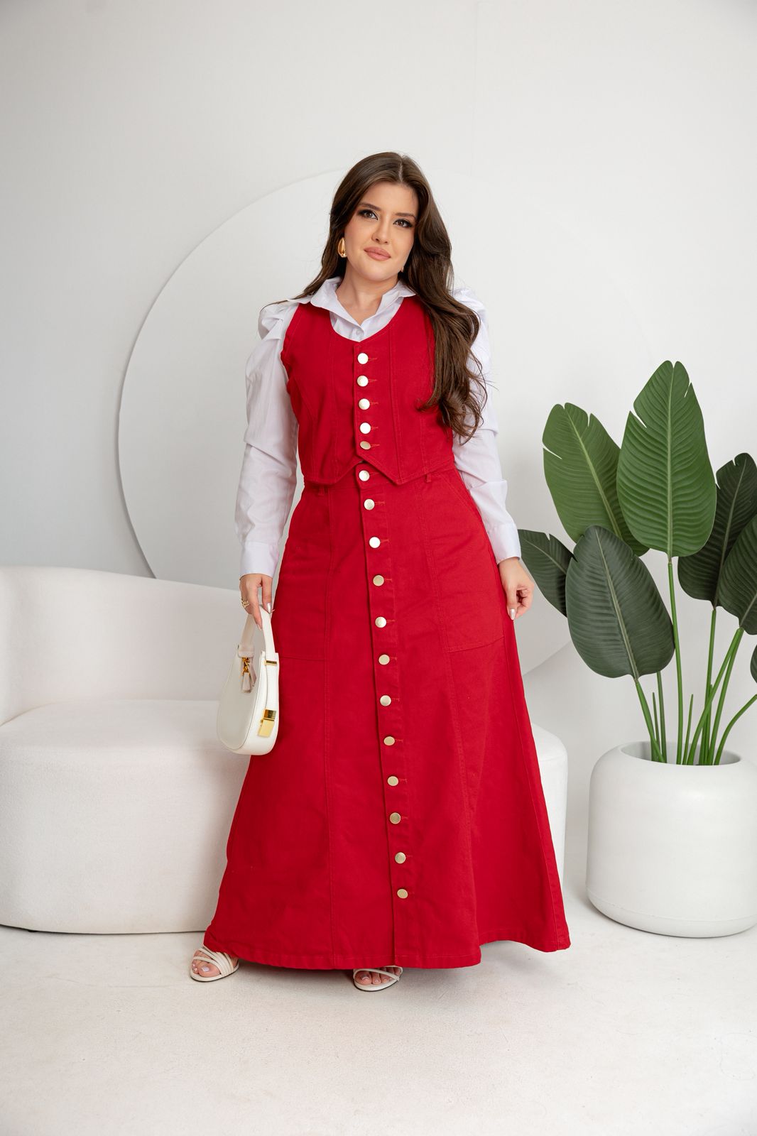 Conjunto em jeans com uma lavagem moderna Marsala, composto por uma saia Longa com  bolsos fundos e botões dourados e por um colete com botões dourados, podendo usar as peças separadas pois são muitos versáteis para qualquer combinação. É paixão das fashionistas, são atemporais porque nunca sai de moda.